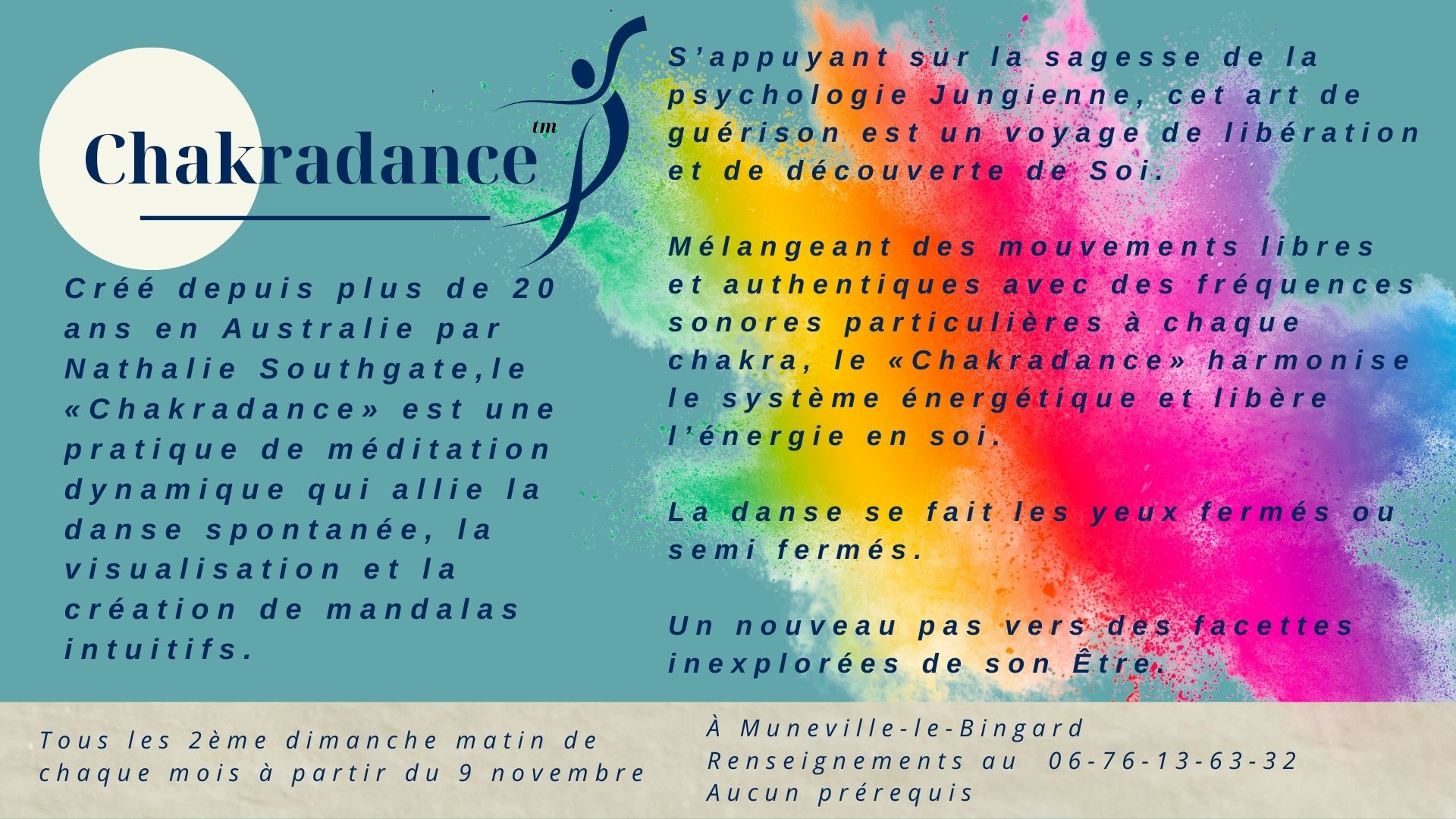Créé depuis plus de 20 ans en Australie par Nathalie Southgate,le «Chakradance» est une pratique de méditation dynamique qui allie la danse spontanée, la visualisation et la création de mandalas intuitifs. S’appuyant sur la sagesse de la psychologie Jungienne, cet art de guérison est un voyage de libération et de découverte de Soi. Mélangeant des mouvements libres et authentiques avec des fréquences sonores particulières à chaque chakra, le «Chakradance» harmonise le système énergétique et libère l’énergie en soi. La danse se fait les yeux fermés ou semi fermés. Un nouveau pas vers des facettes inexplorées de son Être.